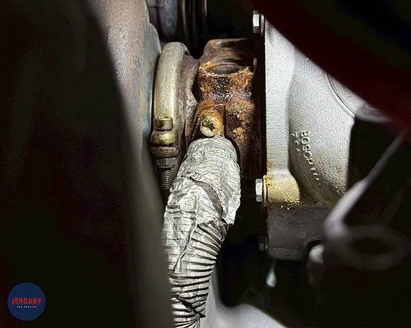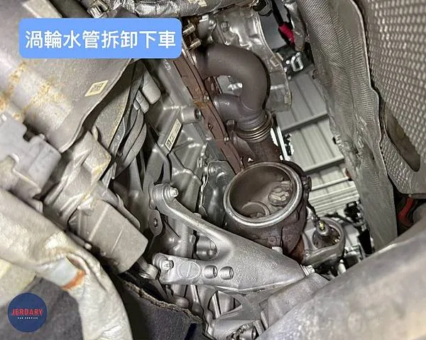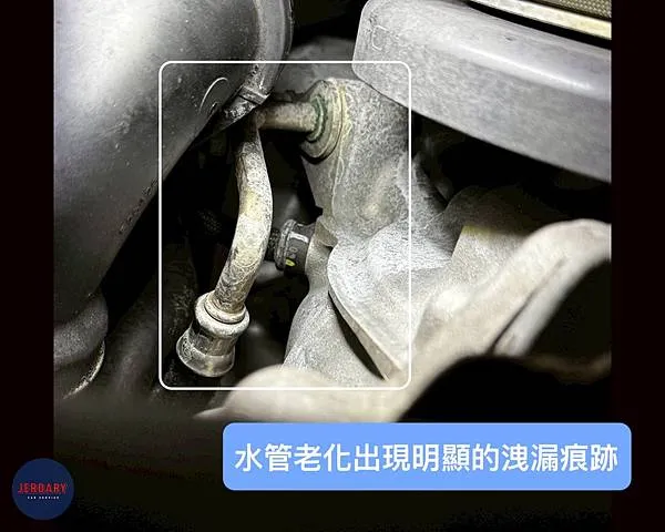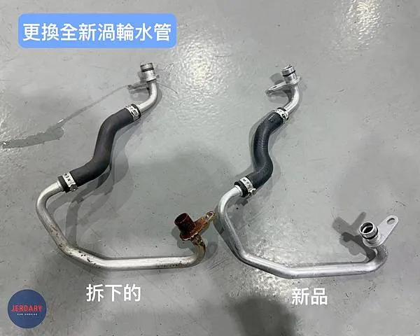 - 渦輪水管老化洩漏: 渦輪運作時產生的高溫,會加速水管的老化。這輛車的渦輪水管已出現明顯的洩漏問題。