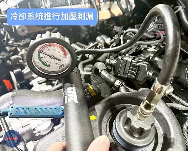 在所有全新零件更換完成後,我們進行加壓側漏檢測。透過接上副水桶進行加壓測試,確保所有更換後的管路與零件都沒有任何洩漏點,保障了維修品質與行車安全。