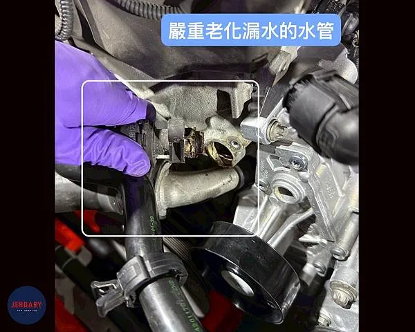 - 副水桶洩漏: 副水桶負責儲存多餘的冷卻液並維持系統壓力。我們發現副水桶已出現明顯的洩漏痕跡。