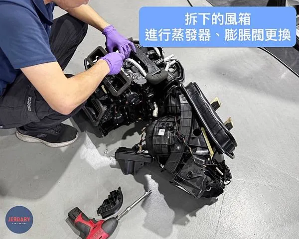 - 拆風箱更換全新蒸發器與膨脹閥: 由於蒸發器和膨脹閥是冷氣製冷的核心部件,一旦損壞或洩漏就會導致冷氣失效。我們專業且小心拆卸儀表台,將風箱總成取出,更換了全新的蒸發器與膨脹閥,徹底根除冷媒洩漏與製冷效率低下的問題。