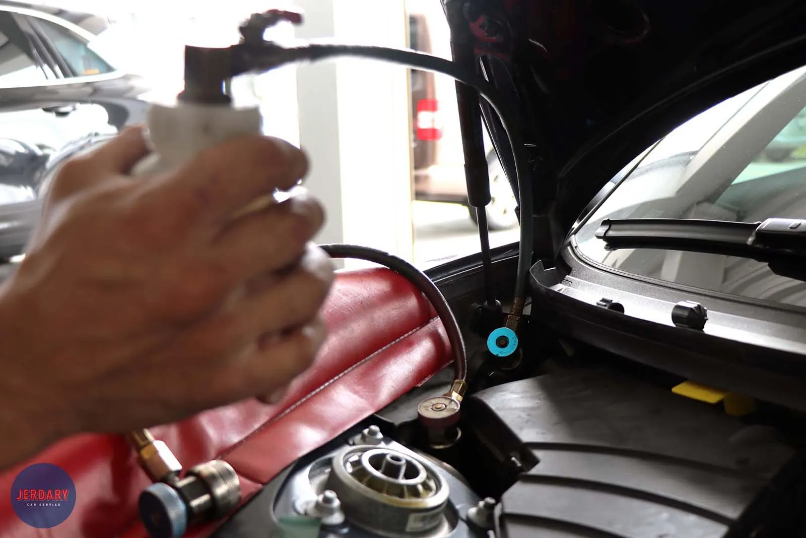 使用汽車專業冷氣系統管路清洗機,對車輛冷氣系統進行清潔。