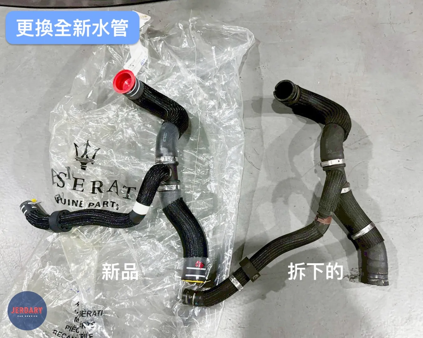 - 水管漏水更換新品: 檢查發現冷卻管路出現滲漏現象,我們立即更換了全新水管。老化的管路在高壓下極易爆裂,及時更換是避免引擎過熱受損的唯一方法。
