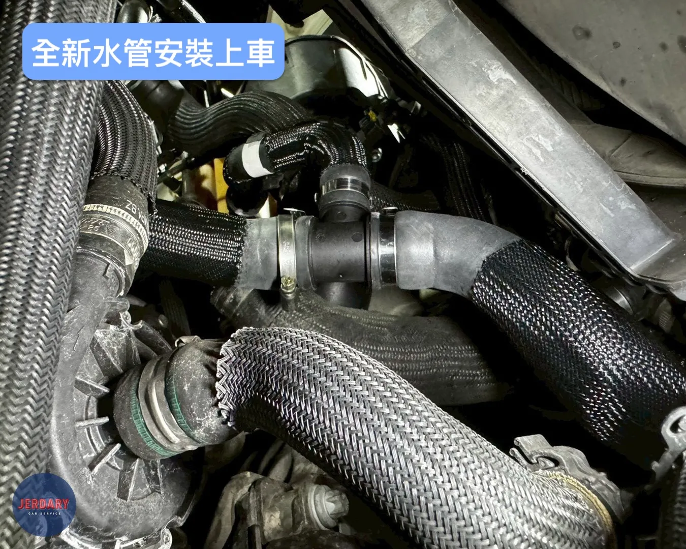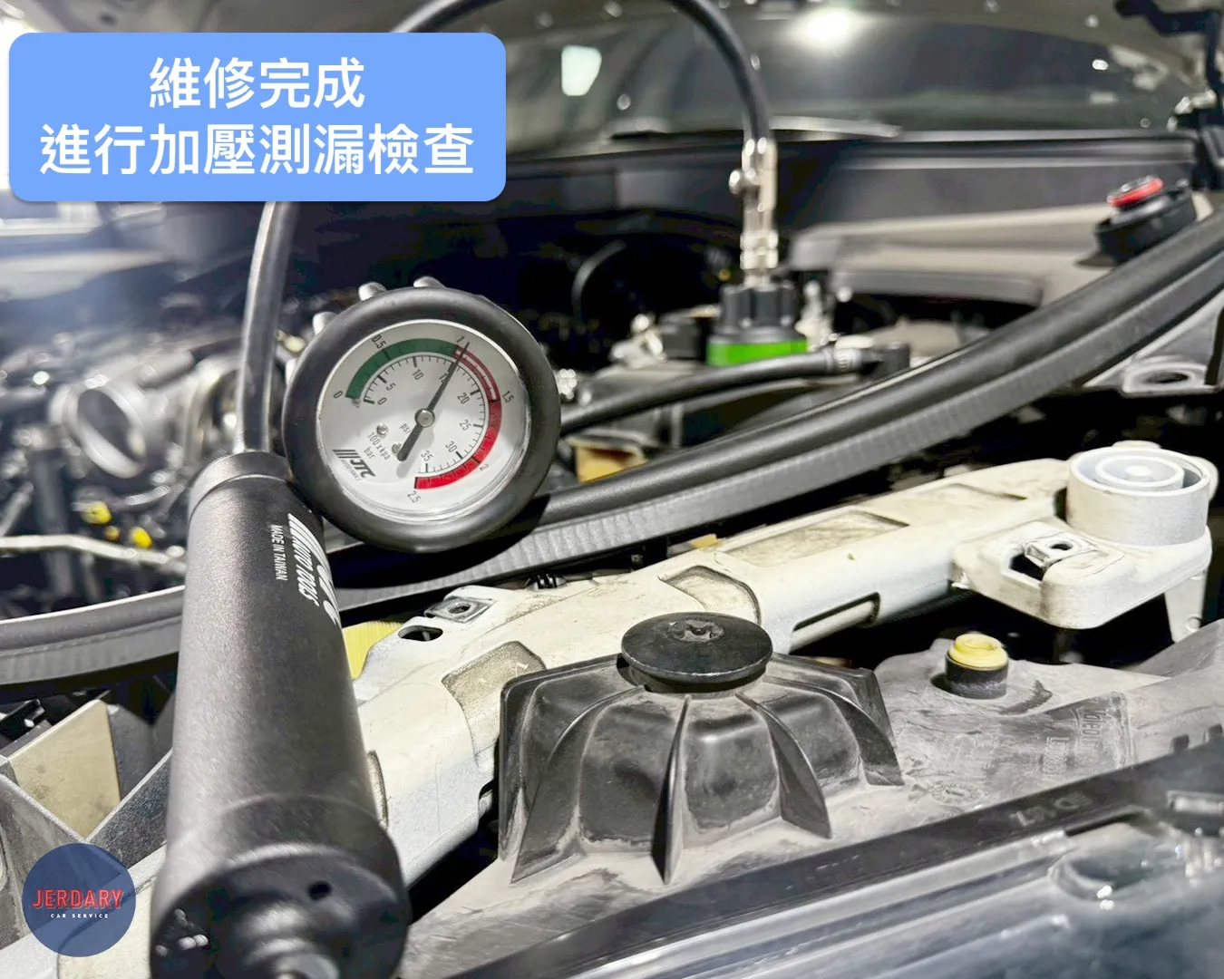 - 嚴謹的加壓測漏檢查: 維修完成後,我們進行了專業的冷卻系統加壓測漏。透過加壓設備模擬引擎運作壓力,確保新更換的水管及所有接頭達到 100% 的密封,確保長途行駛無後顧之憂。