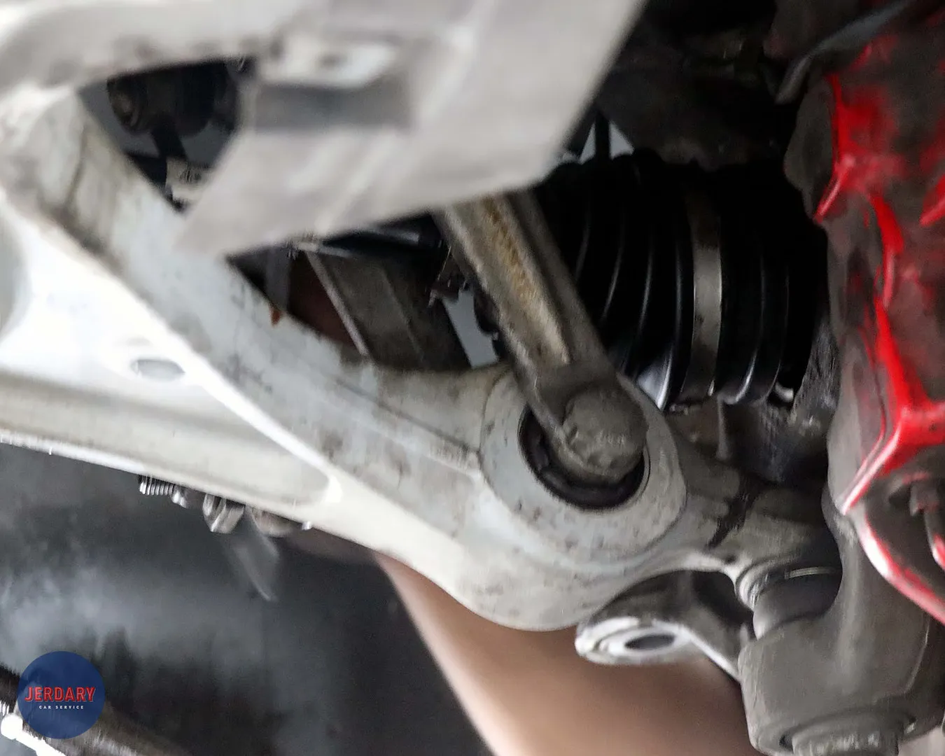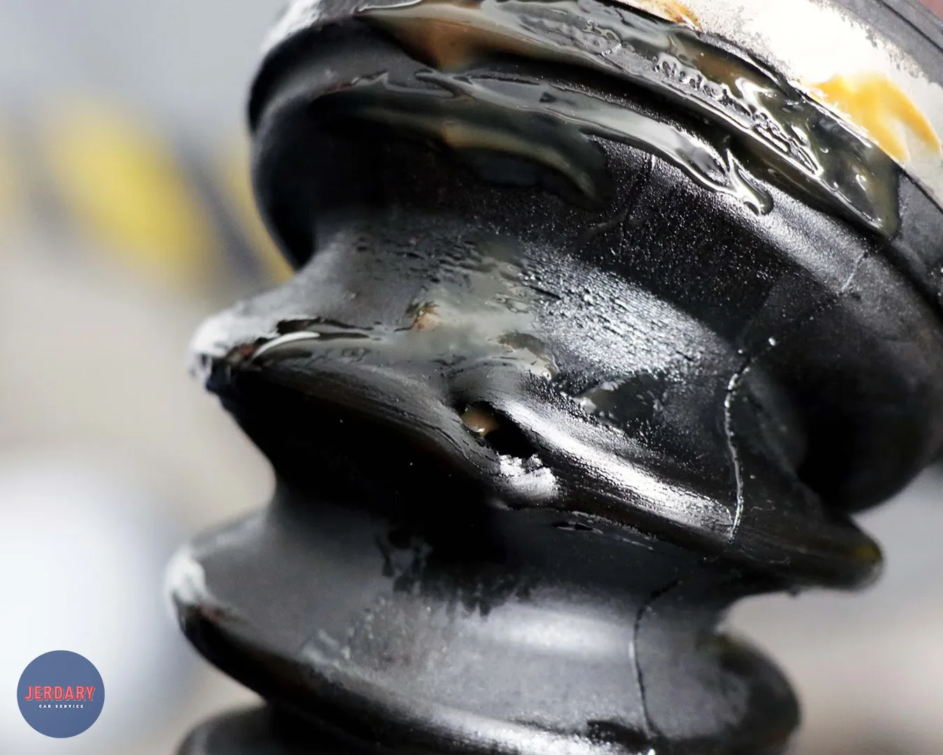 圖中可以看到防塵套因破裂導致潤滑油噴灑到底盤各處。