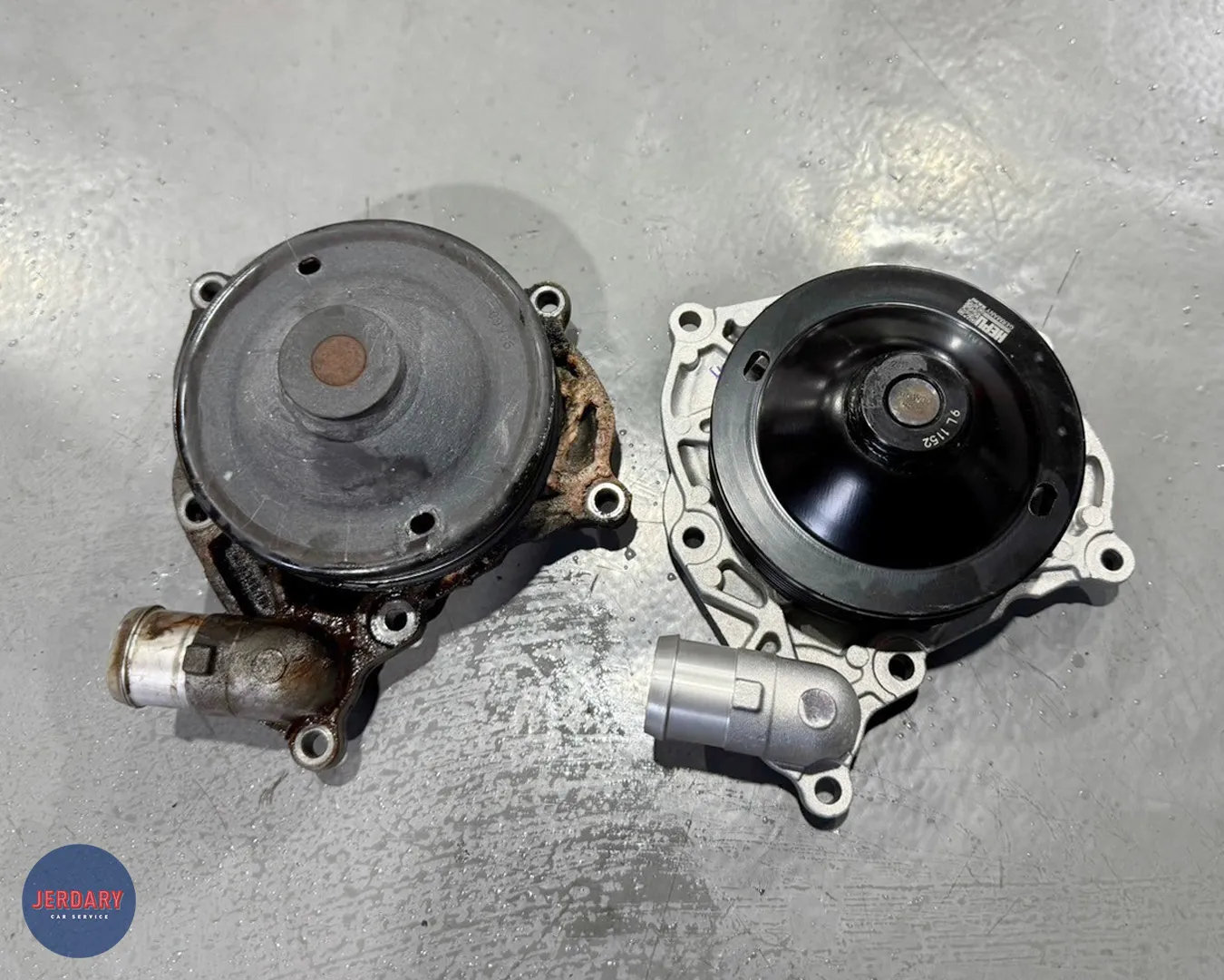 拆下的故障舊水泵浦與準備安裝上車的新品。